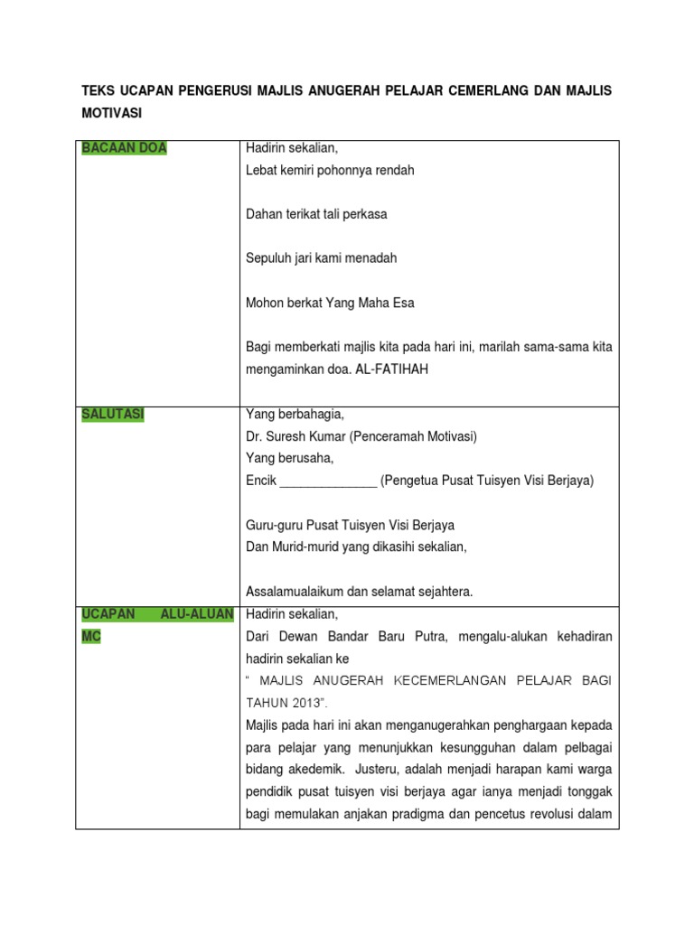 Teks Ucapan Pengerusi Majlis Anugerah Pelajar Cemerlang Dan Majlis Motivasi Pdf