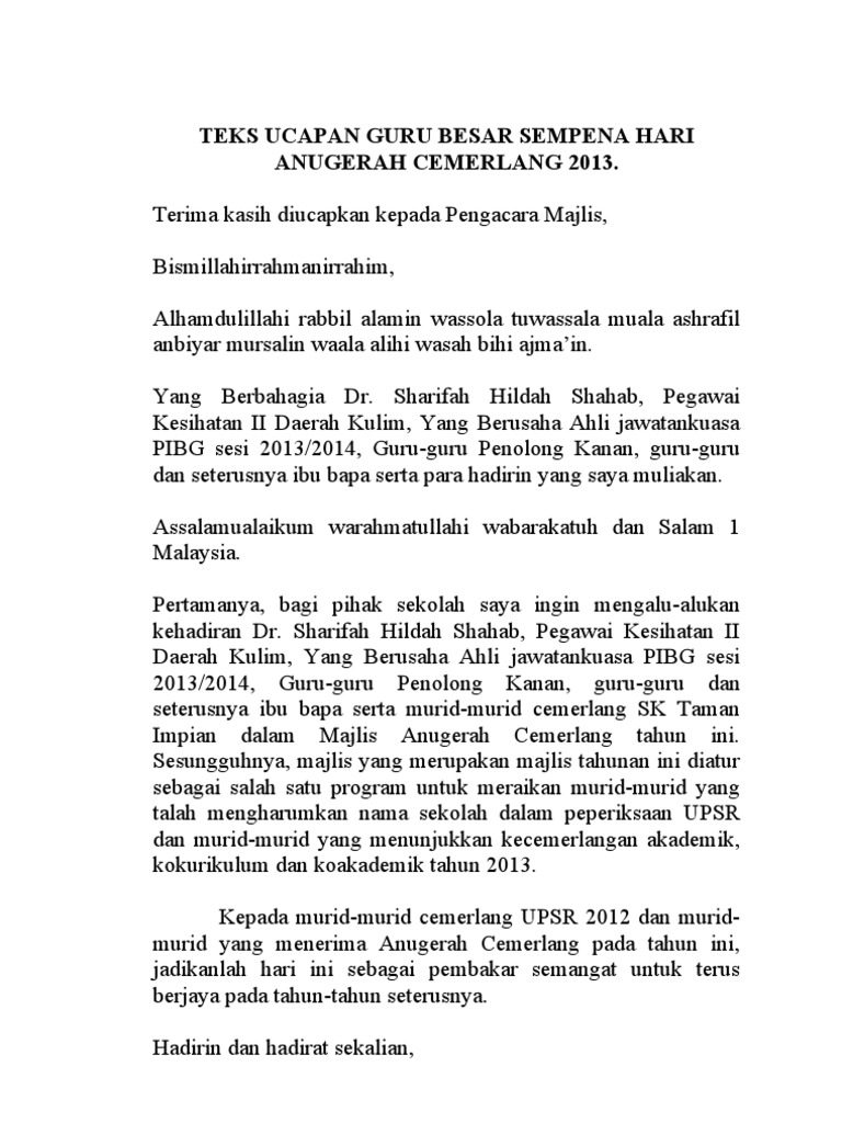 Teks Ucapan Guru Besar Sempena Hari Anugerah Cemerlang 2013 Pdf